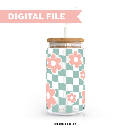 [ Digital File ] 16oz Libbey Can Wrap SVG | Retro Flower Checkered SVG