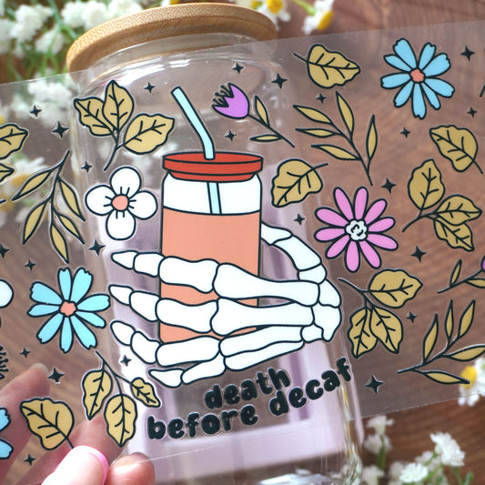 [ Double Sided ] 16oz Cup UV DTF Decal | Death Before Decaf Floral