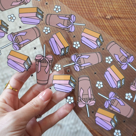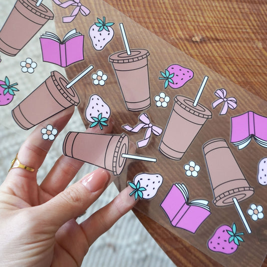 [ Double Sided ] 16oz Cup UV DTF Decal | Bow, Books & Iced Coffee