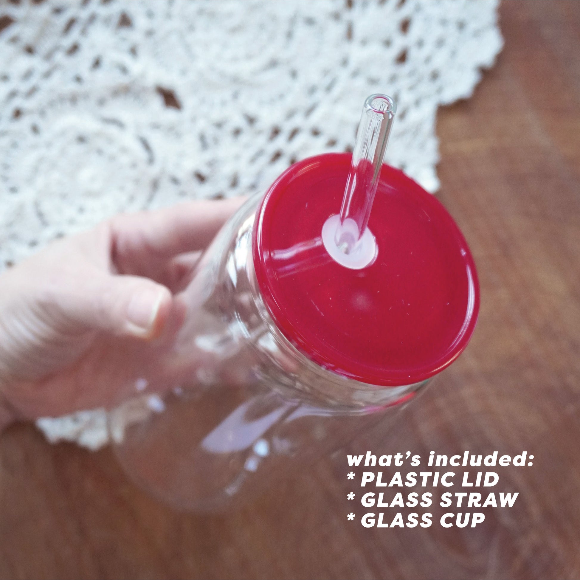 Accessories: Clear Glass Straw & Burgundy Plastic Lid & Glass Cup