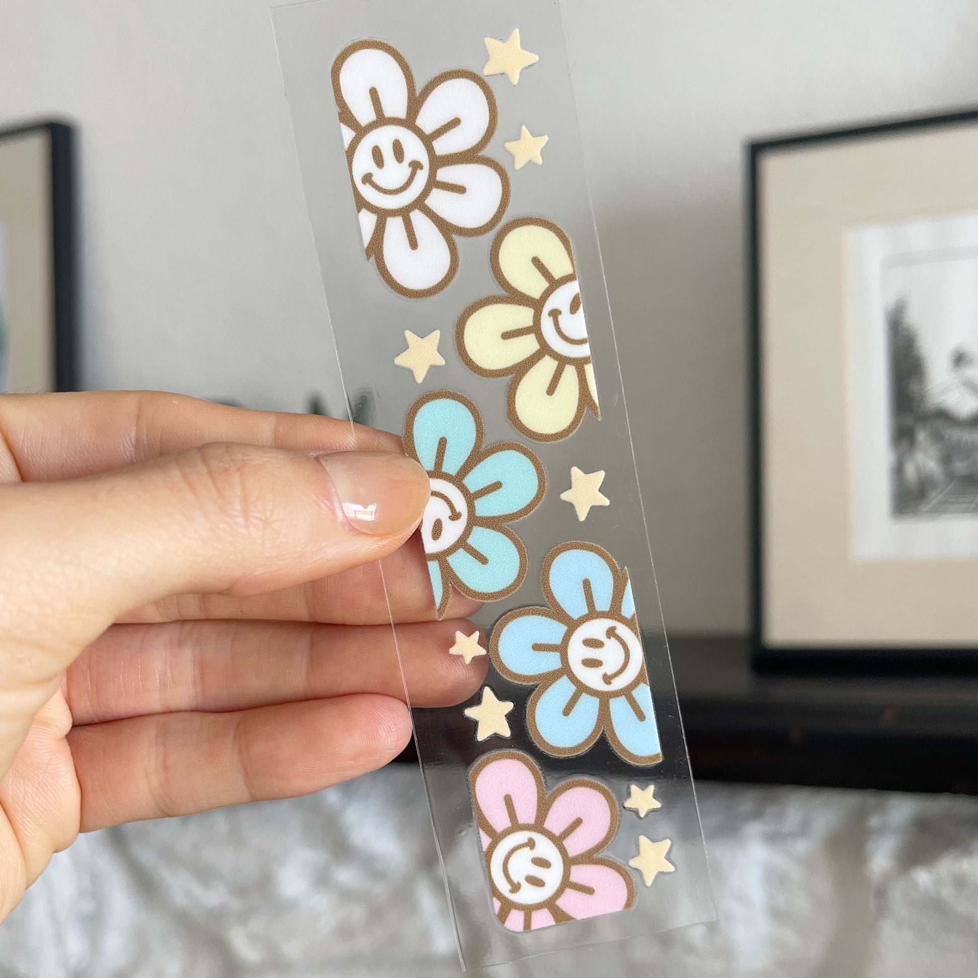 Easy to apply. No more cutting vinyl color by color. Blooming Smiles: UV DTF Floral Smiley Face Bookmark Decal 📚🌸😃