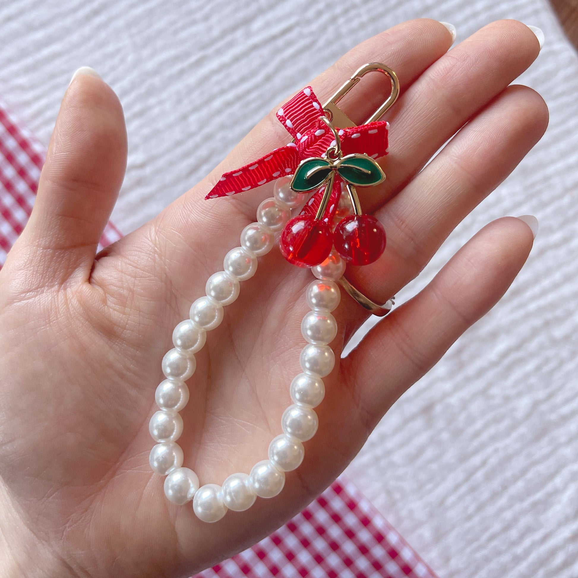 Details: Fixed-length pearl bead wrist strap, cherry and bow charms, secure metal clasp. Perfect for carrying keys, small essentials, or adding charm to bags.