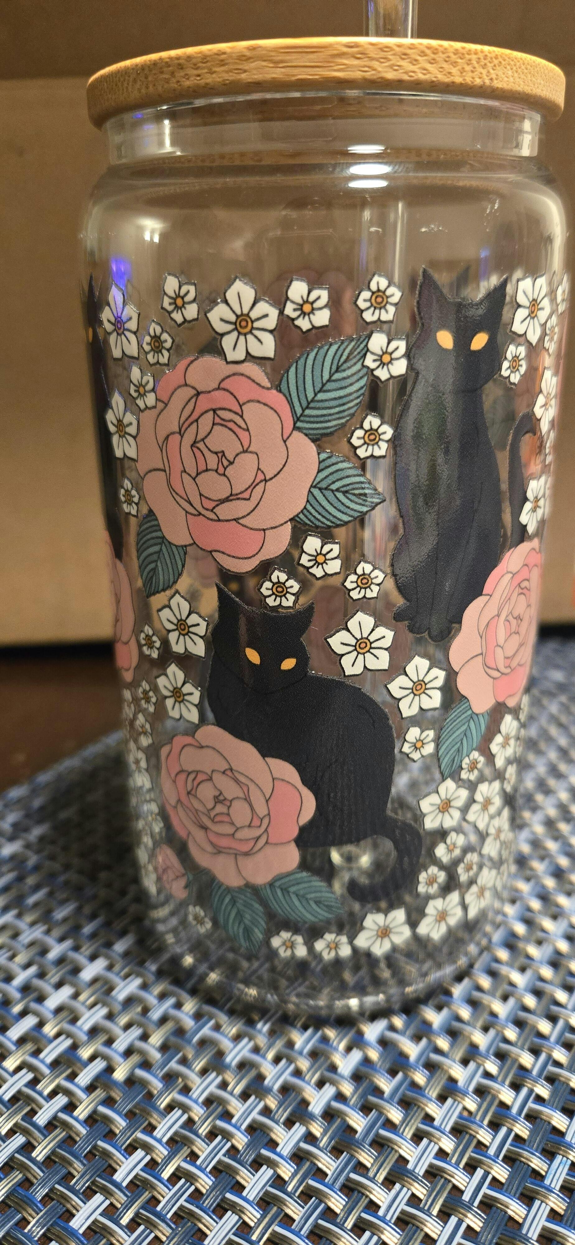 [ Double Sided ] 16oz Cup UV DTF Decal | Black Cat & Roses