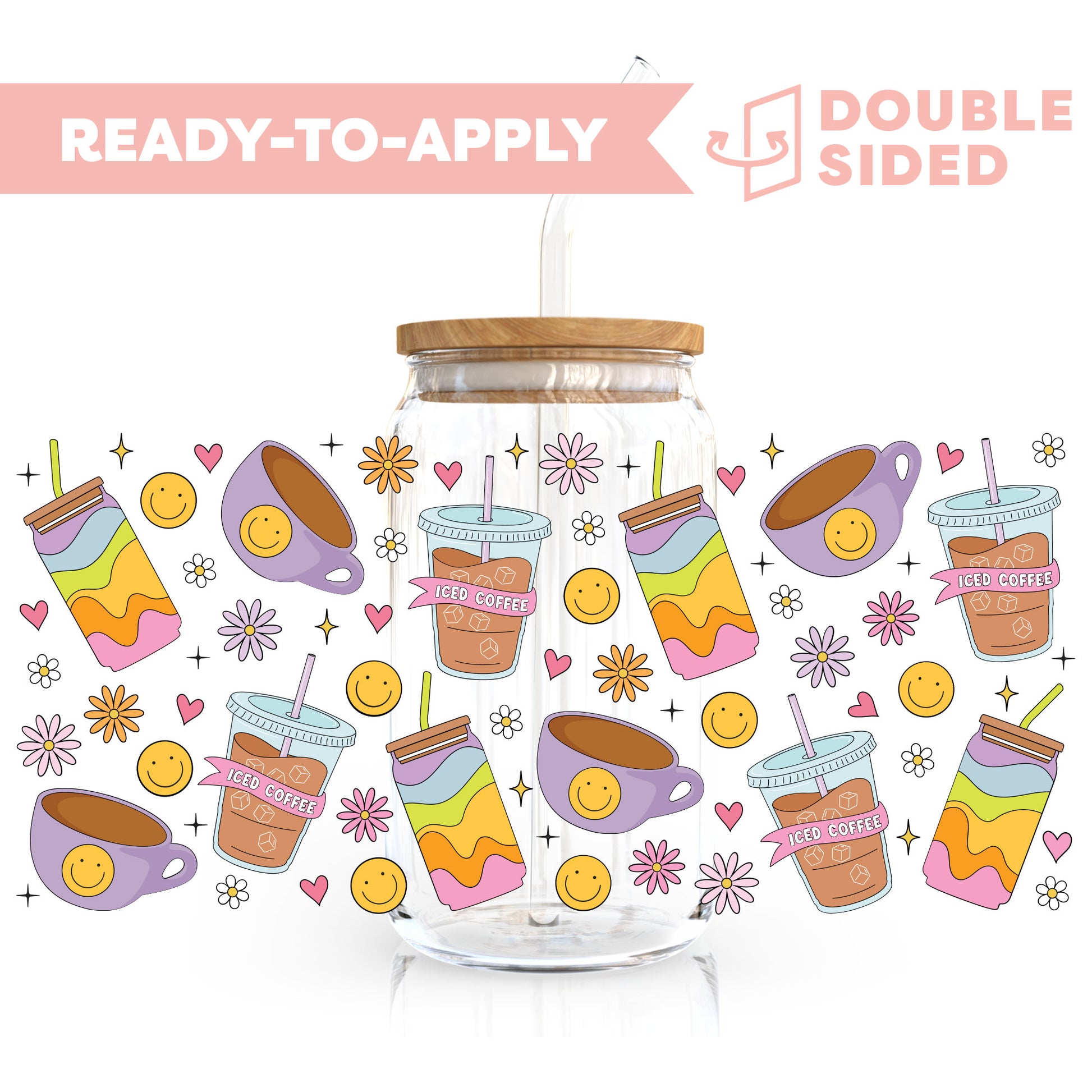 🌈🥤✨ Brighten up your glass cup and more with our [Double Sided] 16oz Happy Rainbow Iced Coffee UV DTF Decal—an easy and fast way to add a splash of joy to your seasonal sips!