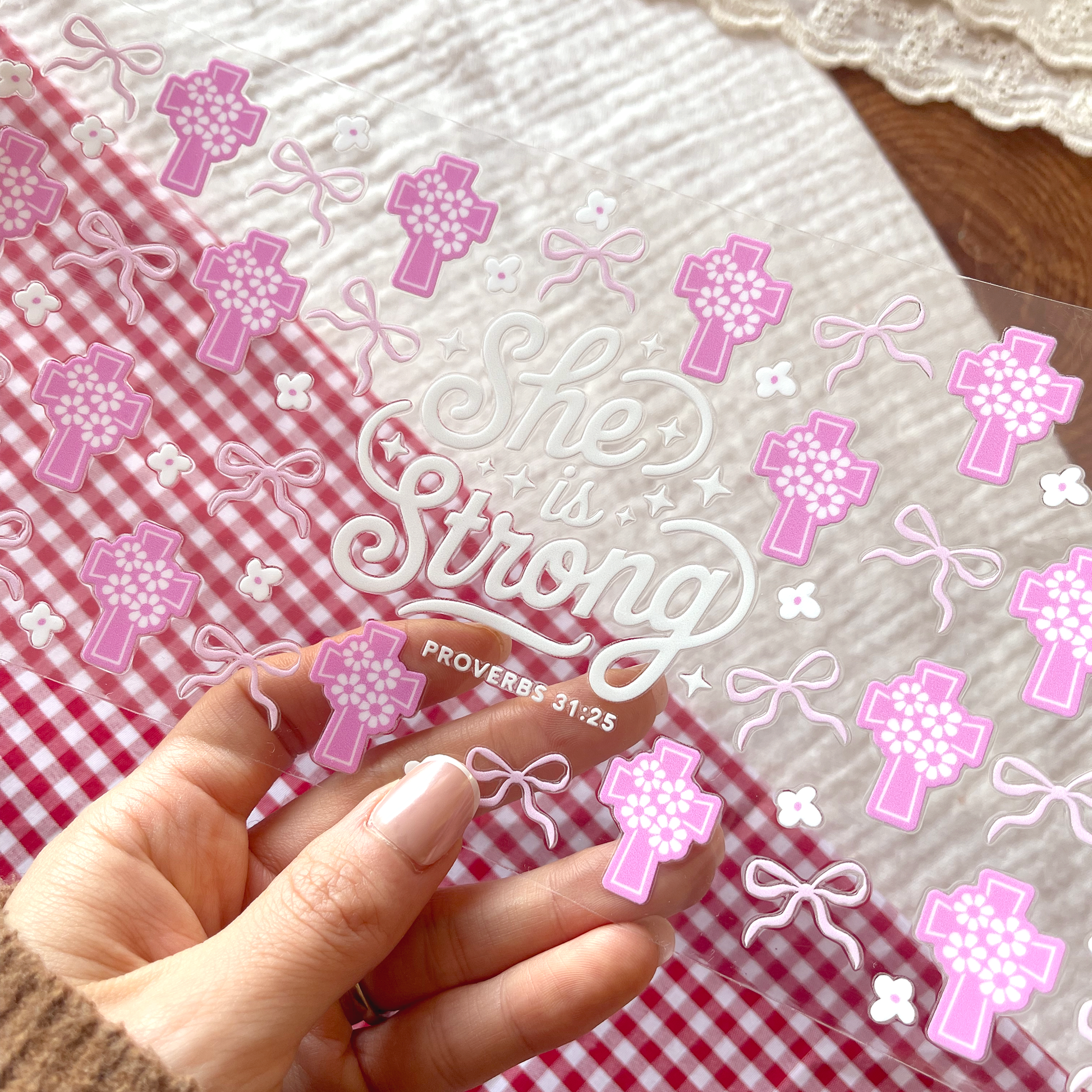 [ Double Sided ] 16oz Cup UV DTF Decal | "She Is Strong" with Floral Cross