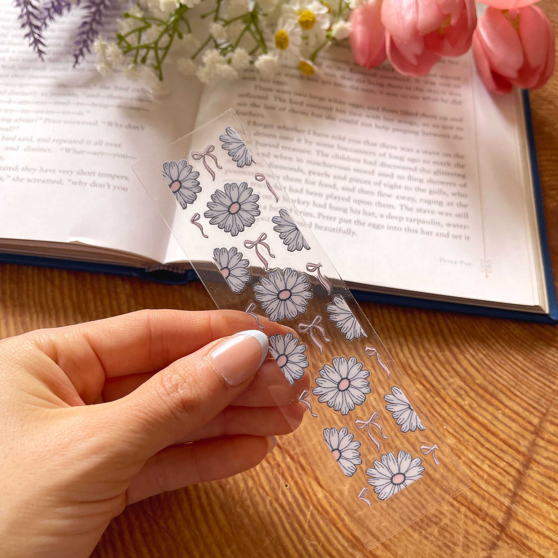 Fresh blue daisies bloom on both sides—a cheerful bookmark for endless reading joy! 🌼🔵