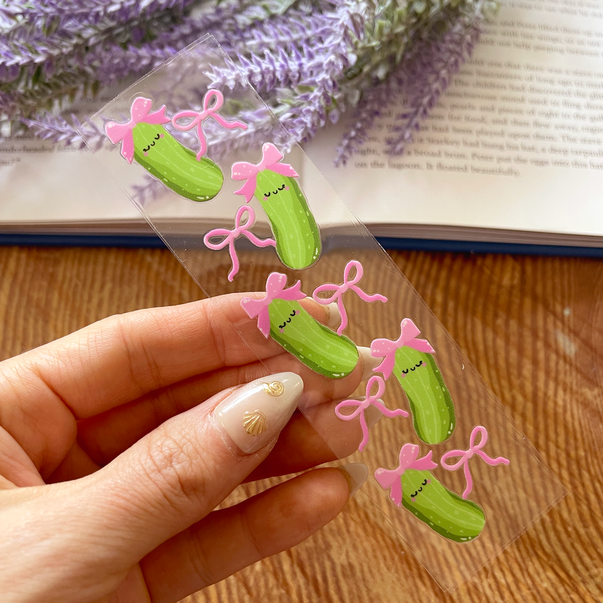 Playful and unique, this Coquette Pickles decal gives your bookmark a quirky twist! 🥒