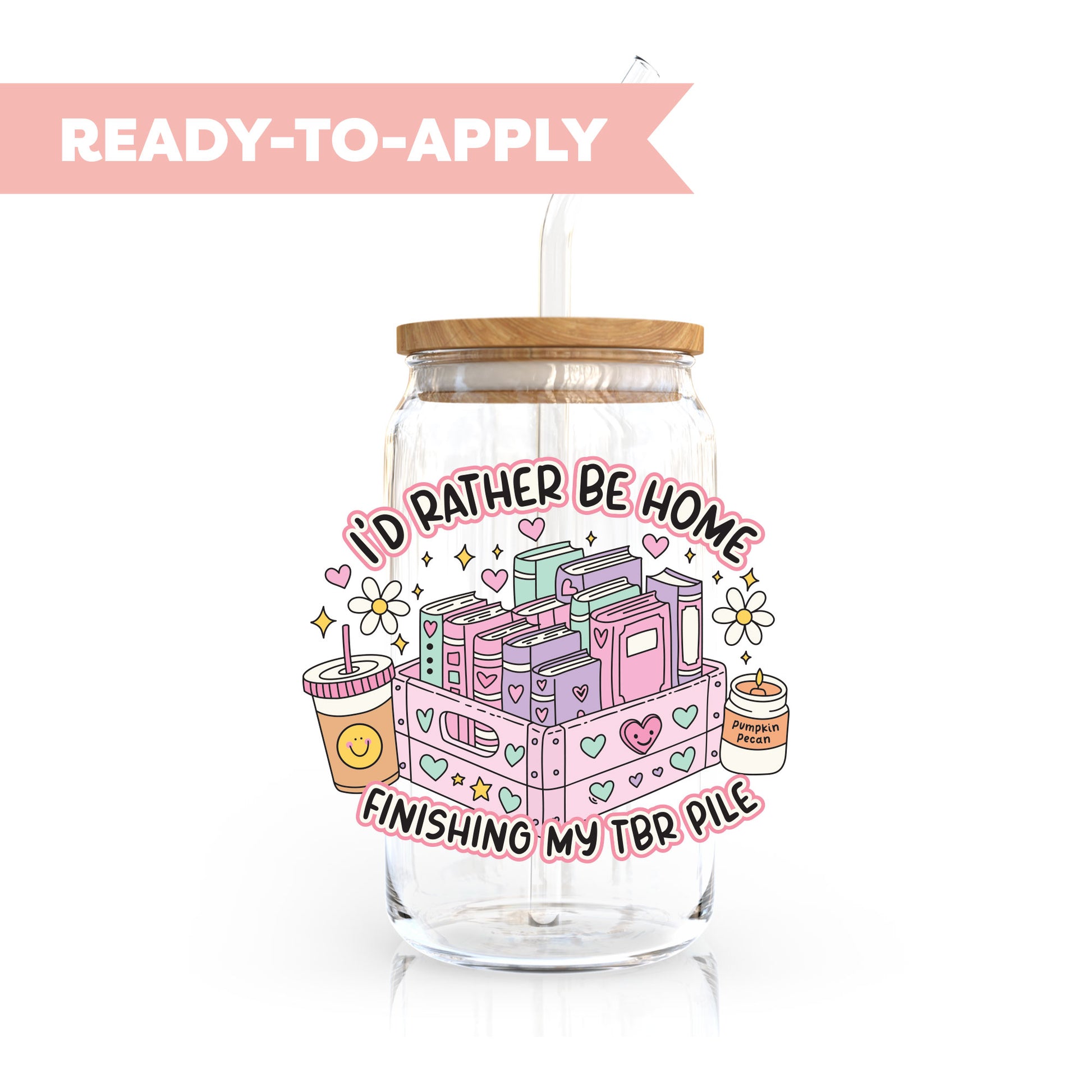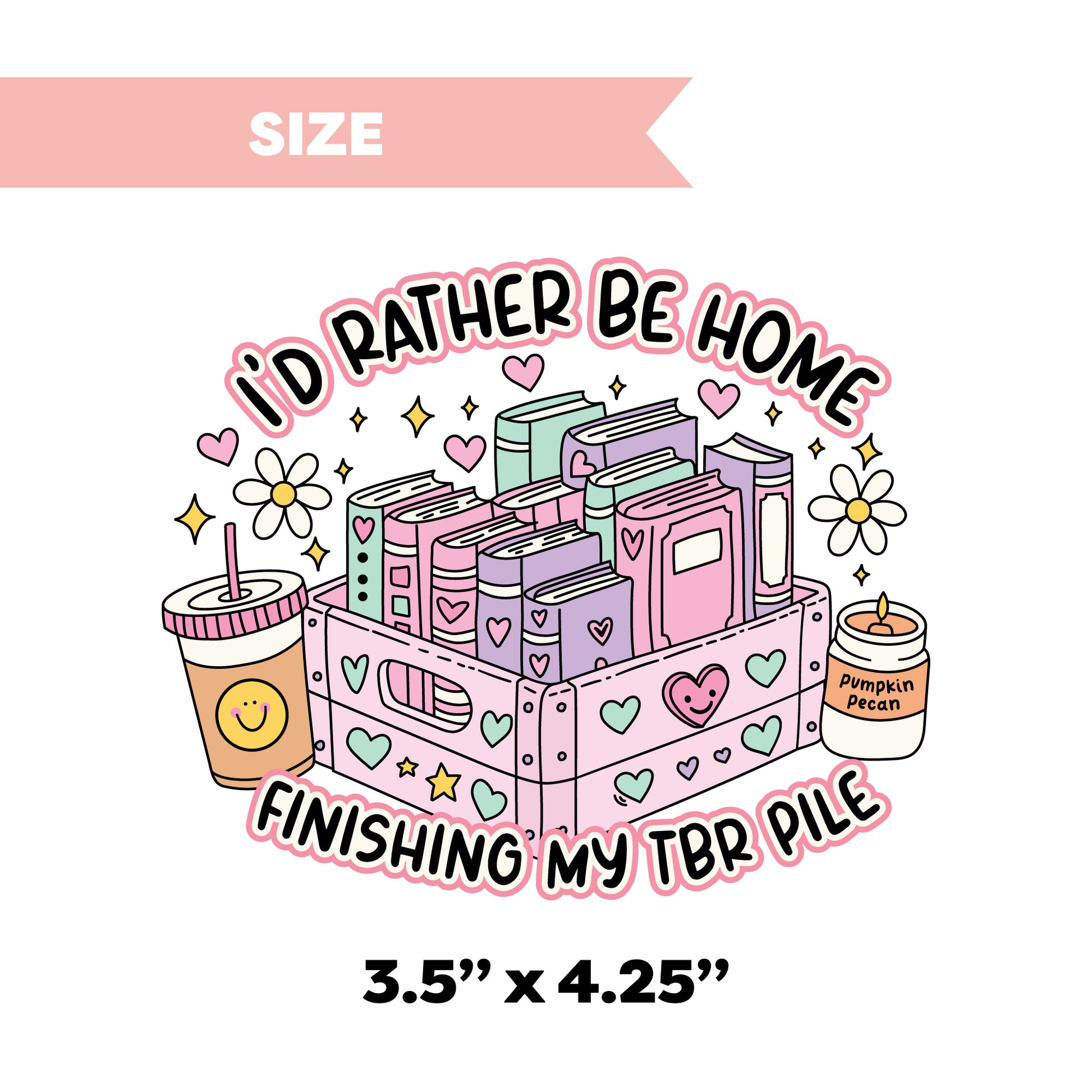 Elevate your cup or surface with bookish charm using our UV DTF Transfer: 'I'd Rather Be Home Finishing My TBR Pile'—because sometimes, the best adventure is in the pages of your next read! 📚✨